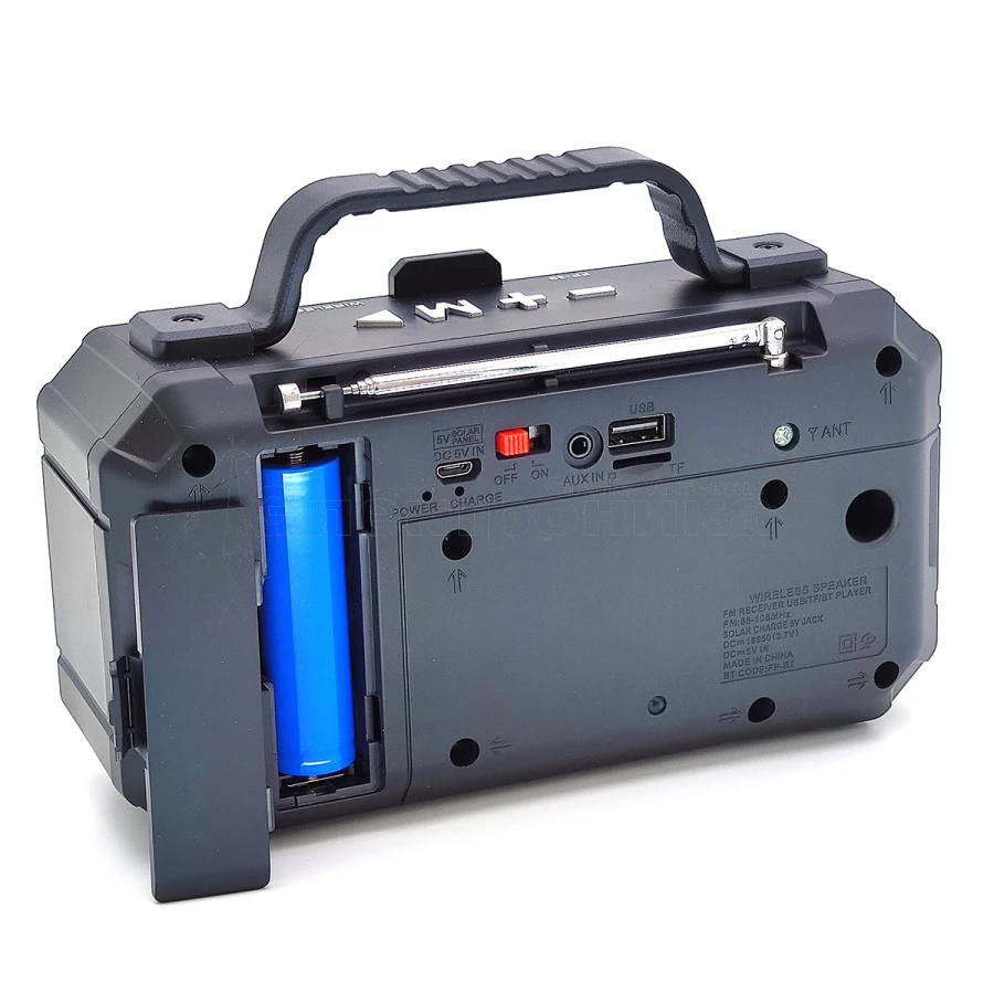Bluetooth/FM Встроенный микрофон AUX(3.5мм) вход/ USB/ TF до 32Гб Выход питания: USB-5В microUSB - шнур ЗУ в комплекте Питание: от аккумулятора 18650 (1200mA) - в комплекте Bluetooth: есть FM: 88-108 MHz USB: есть AUX: есть Встроенный аккумулятор: нет AM: нет SW: нет Размер: 185*75*129 мм Материал: пластик